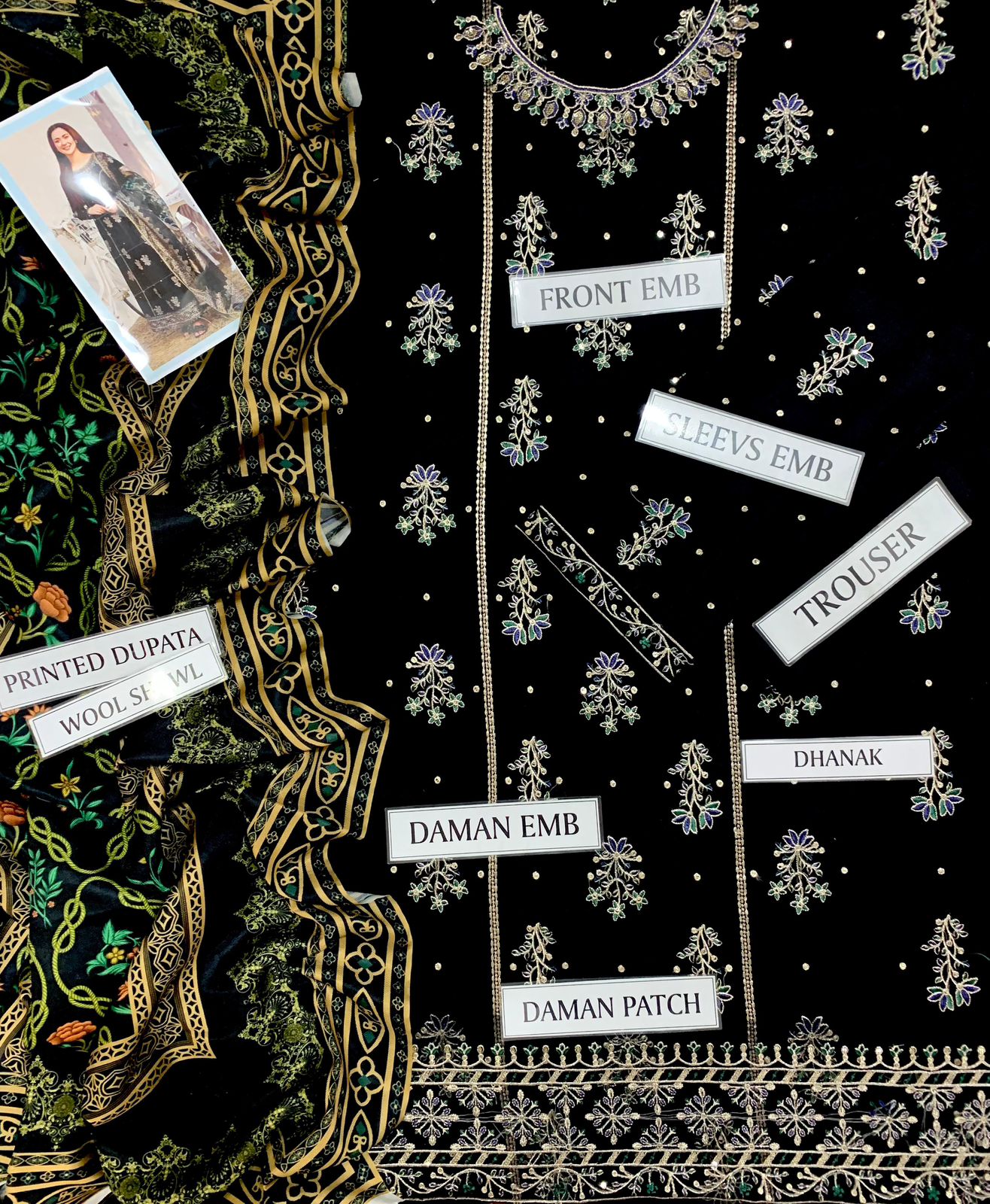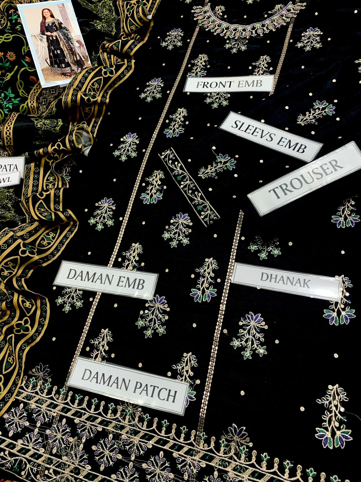 The organza dupatta elevates the design with its four-sided embroidered borders, further enhanced with tassels and pallou detailing that bring movement and depth to the ensemble. Paired with a shamosh silk trouser embroidered with spangle lace, this suit achieves a seamless blend of richness and sophistication.