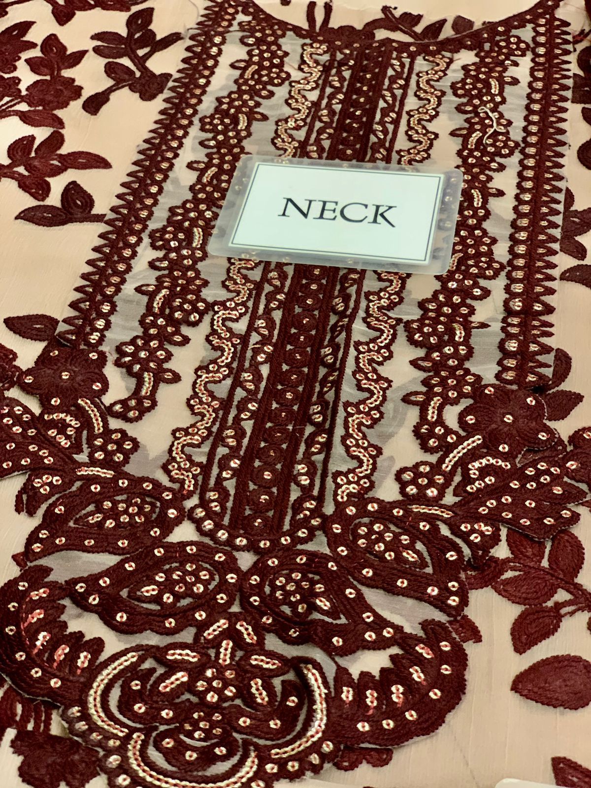 The embroidered back and sleeves mirror the same exquisite detailing, while the organza dupatta completes the ensemble with four-sided embroidered borders, tassel accents, and pallou highlights that flow with grace. A shamosh silk trouser, finished with embroidered lace, provides balance and sophistication to the outfit.