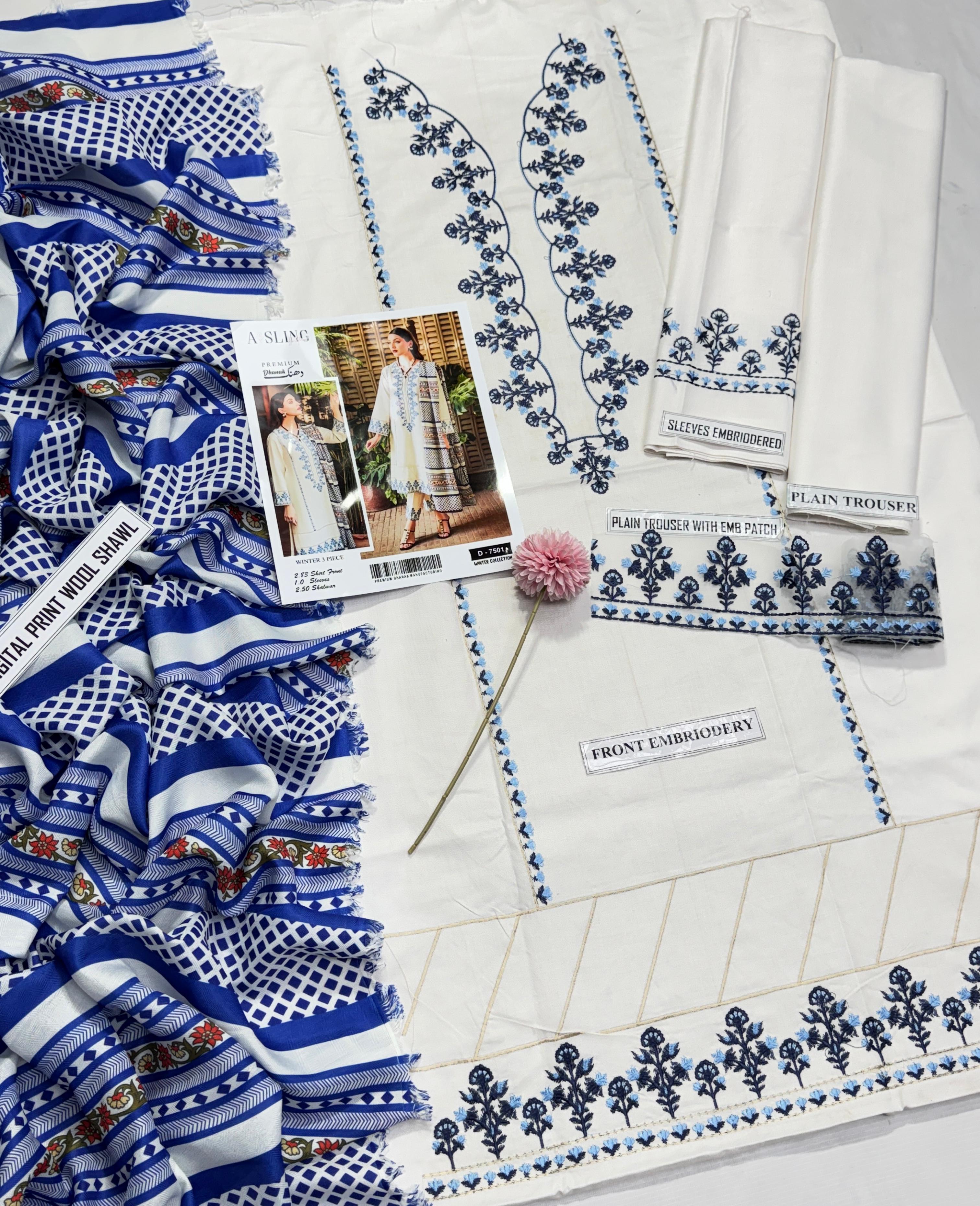 Introducing the Asling 7501, a stunning pearl white ensemble from our Winter Collection 2025. This exquisite suit is adorned with intricate blue embroidery, creating a striking contrast that captivates the eye. Crafted from premium airjet dhanak fabric, the kurta features heavy embroidery across the front and sleeves, showcasing detailed artistry and precision.