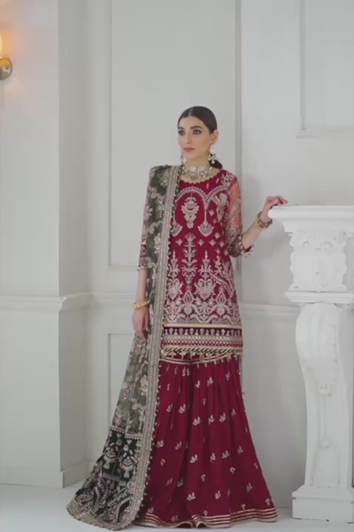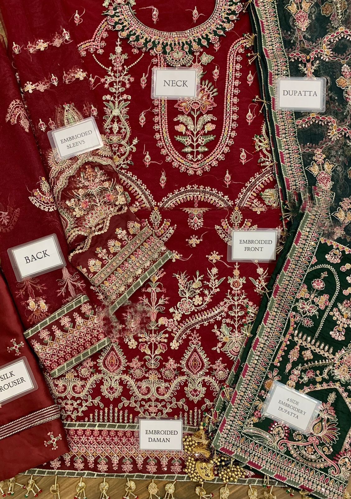 A lavish organza dupatta completes the ensemble, fully embroidered on all sides and finished with ornate pallou borders and tassel accents, offering a flowing drape that exudes sophistication. The look is perfected with a shamose silk trouser, enriched with sequin-embroidered lace for a polished, regal finish.