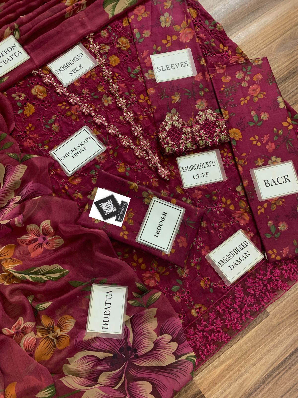 This ensemble is elevated with separate embroidered organza lace for the front and back, and a stunning printed silk dupatta that adds a touch of luxury. Complete with printed cambric trousers, this outfit offers a perfect blend of traditional craftsmanship and contemporary style for any special occasion.