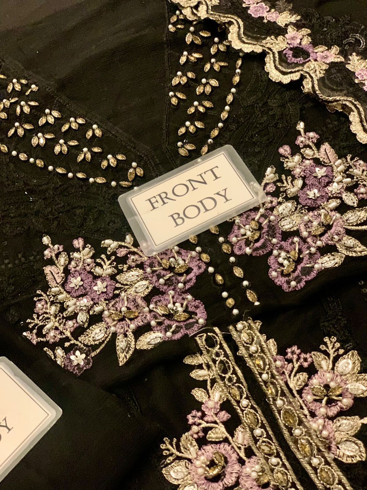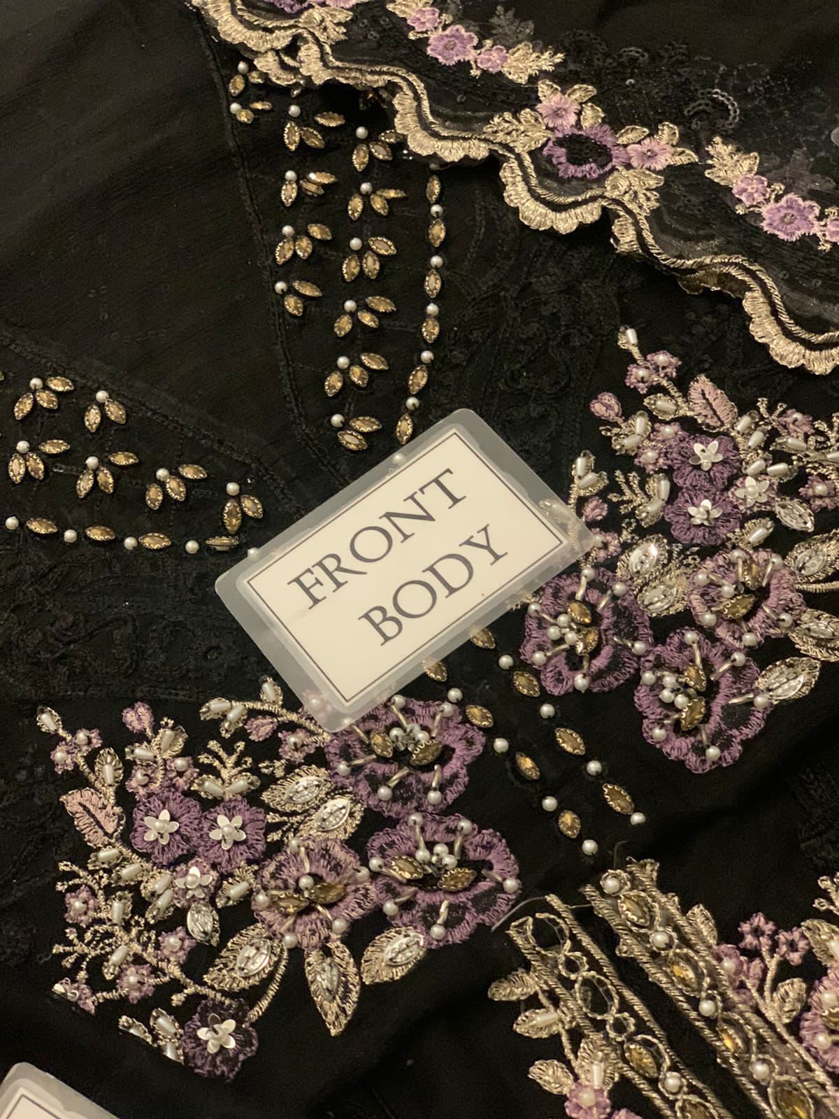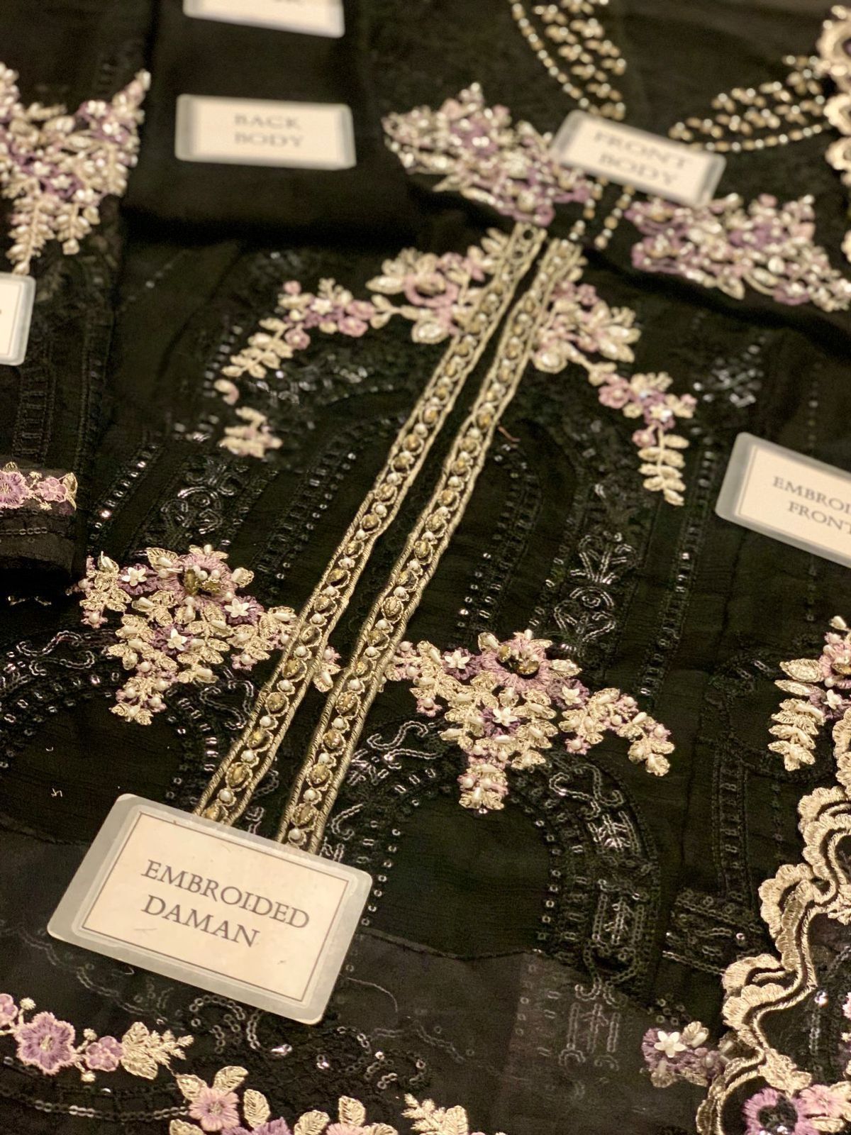 Command attention in this show-stopping Maria B. inspired black lehenga replica. A true masterpiece of craftsmanship, this unstitched ensemble is drenched in luxury. The organza shirt is a work of art, featuring a heavily embroidered front bodice and panels adorned with exquisite 3D flowers and lavish hand embellishment. The drama continues with detailed sleeves and a ghera patti, each meticulously crafted with sparkling embroidery and dimensional details.