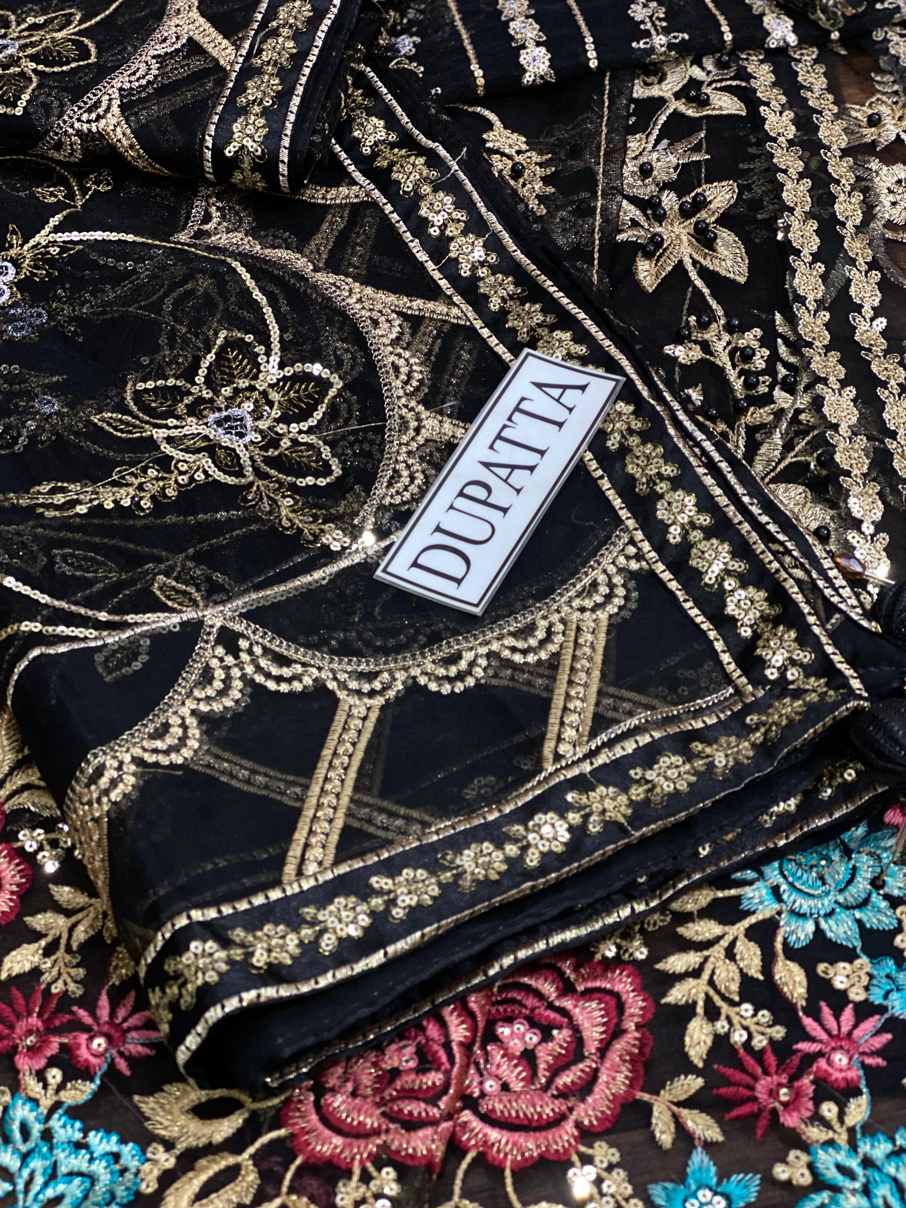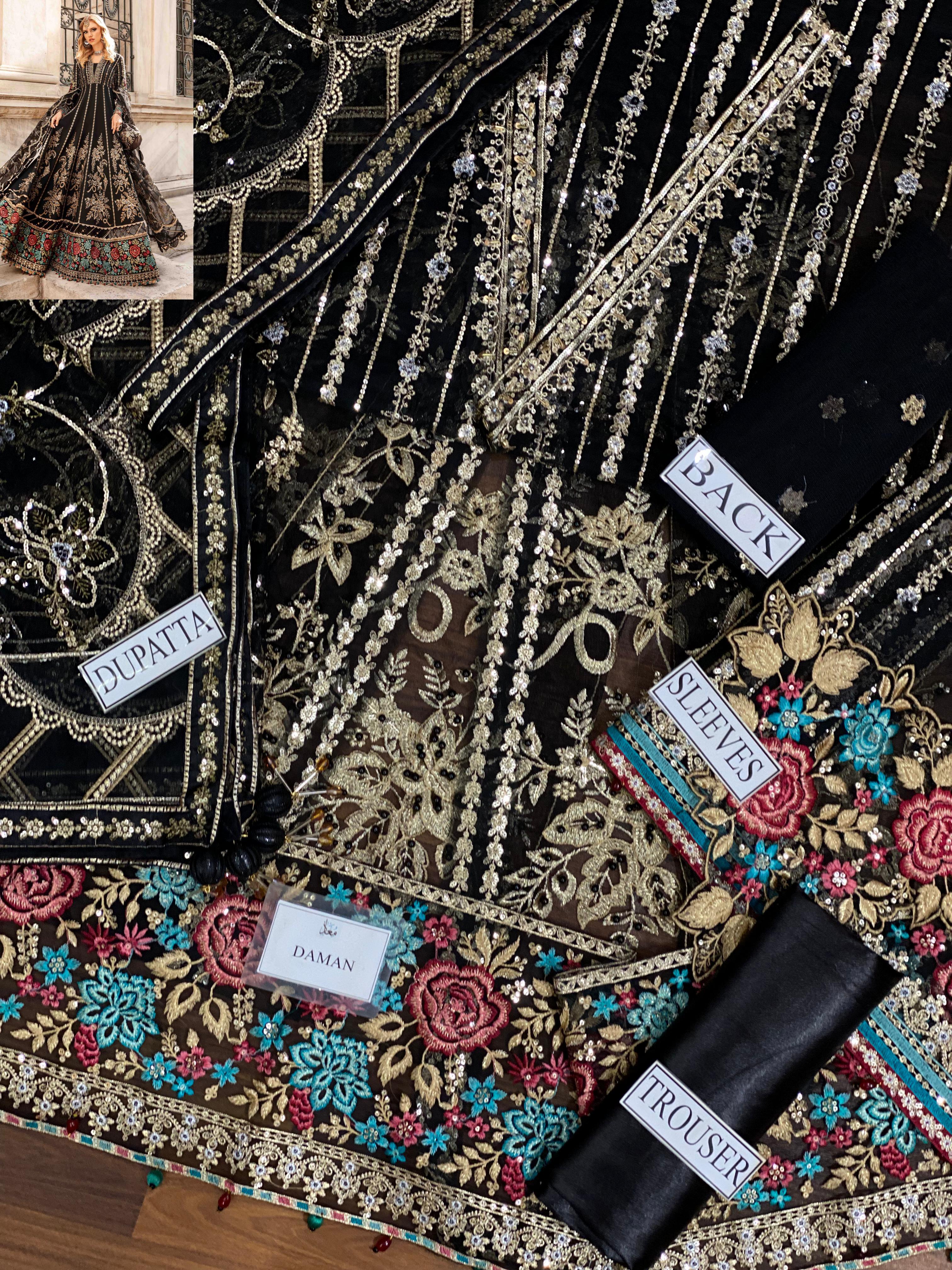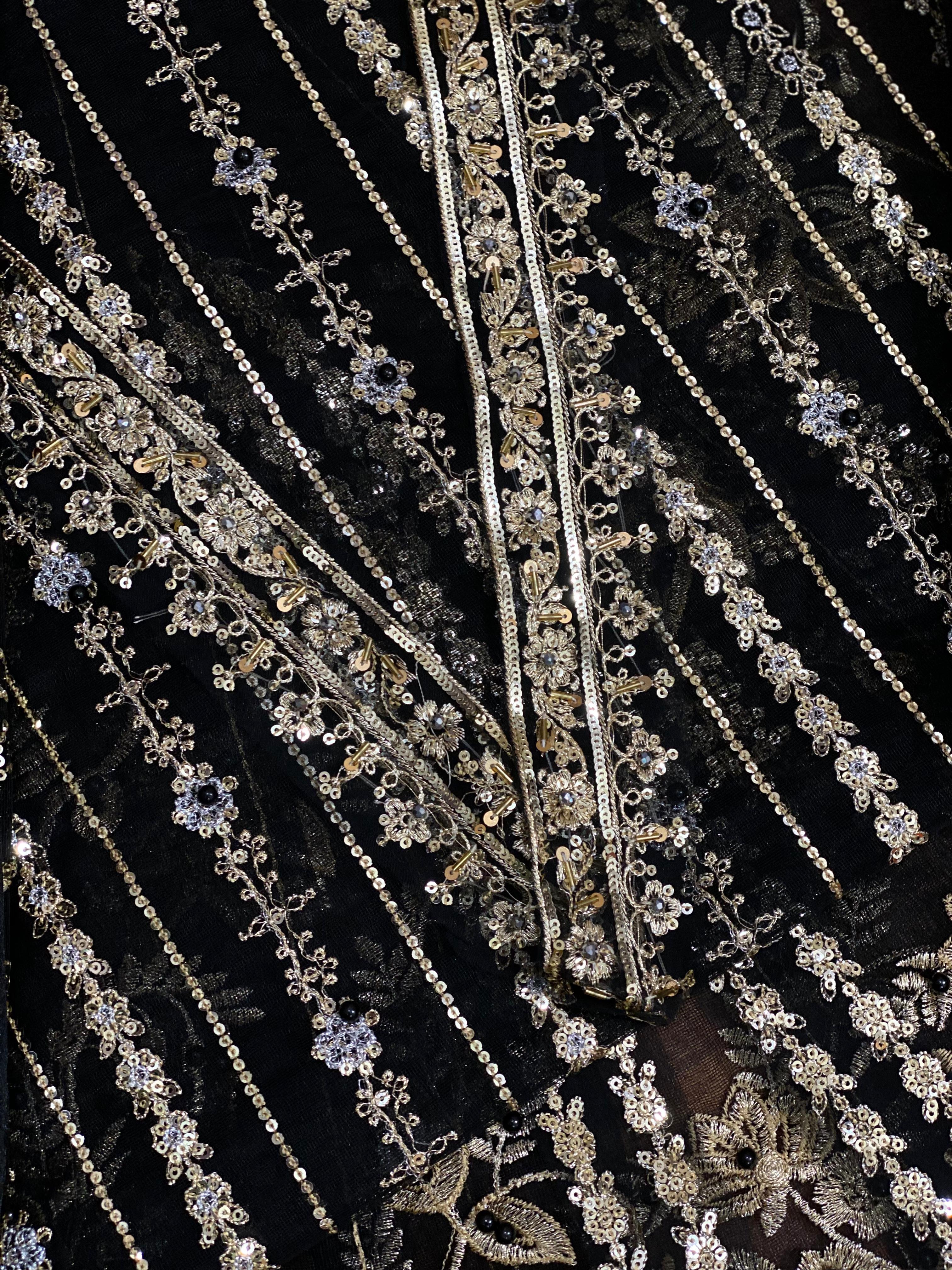 Experience the grandeur of Maria B.'s 2024 bridal collection with this exquisite maxi replica. This masterpiece showcases breathtaking net fabric adorned with heavy zari work, intricate sequence detailing, and elegant cutwork daman. The front and back feature stunning adda work and hand-applied stone embellishments for a truly luxurious feel. The sleeves are beautifully crafted with detailed embroidery and cutwork, while the net dupatta makes a dramatic statement with its four-side heavy embroidered border and elegant attached tassels.