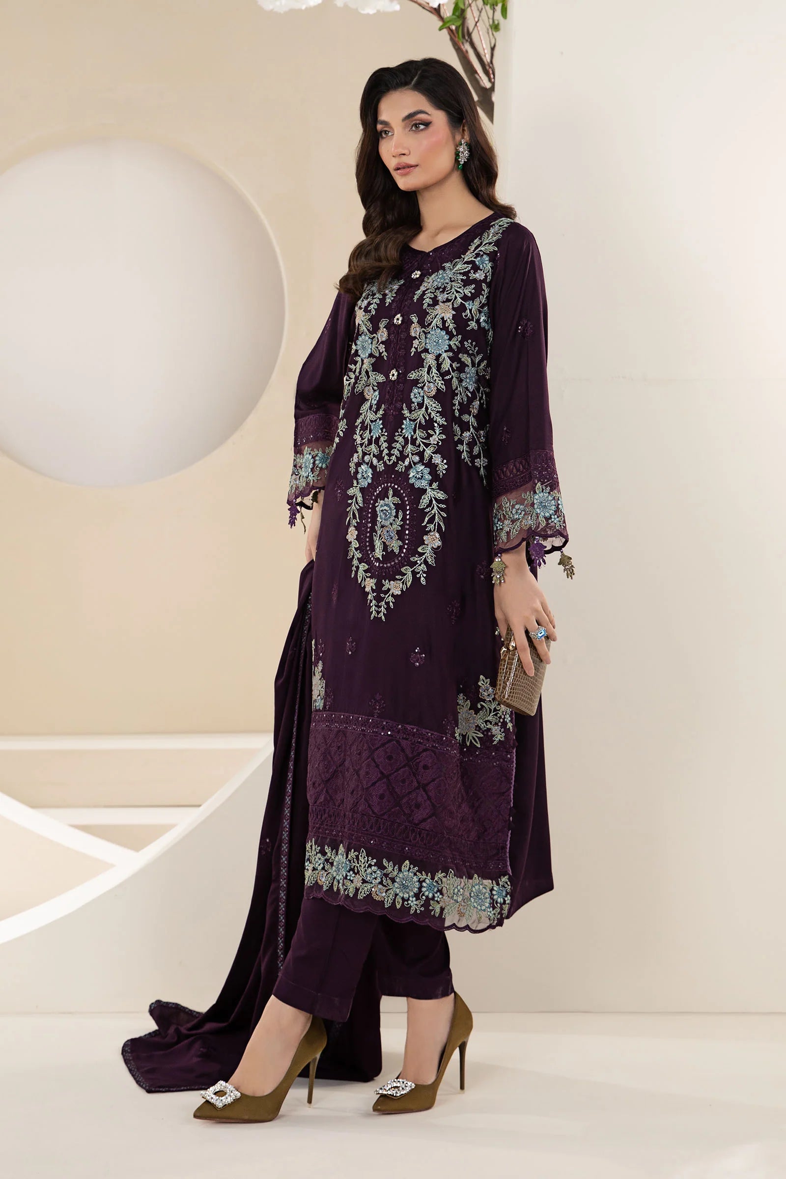 Draped in luxury, the Maria B Enchanted Charm captures the essence of timeless elegance. The net front shimmers with intricate sequin embroidery, gracefully accented by a detailed neckline and richly adorned daman border, finished with delicate fancy tassels. The back and sleeves mirror the same artistry, creating a balanced, refined look.