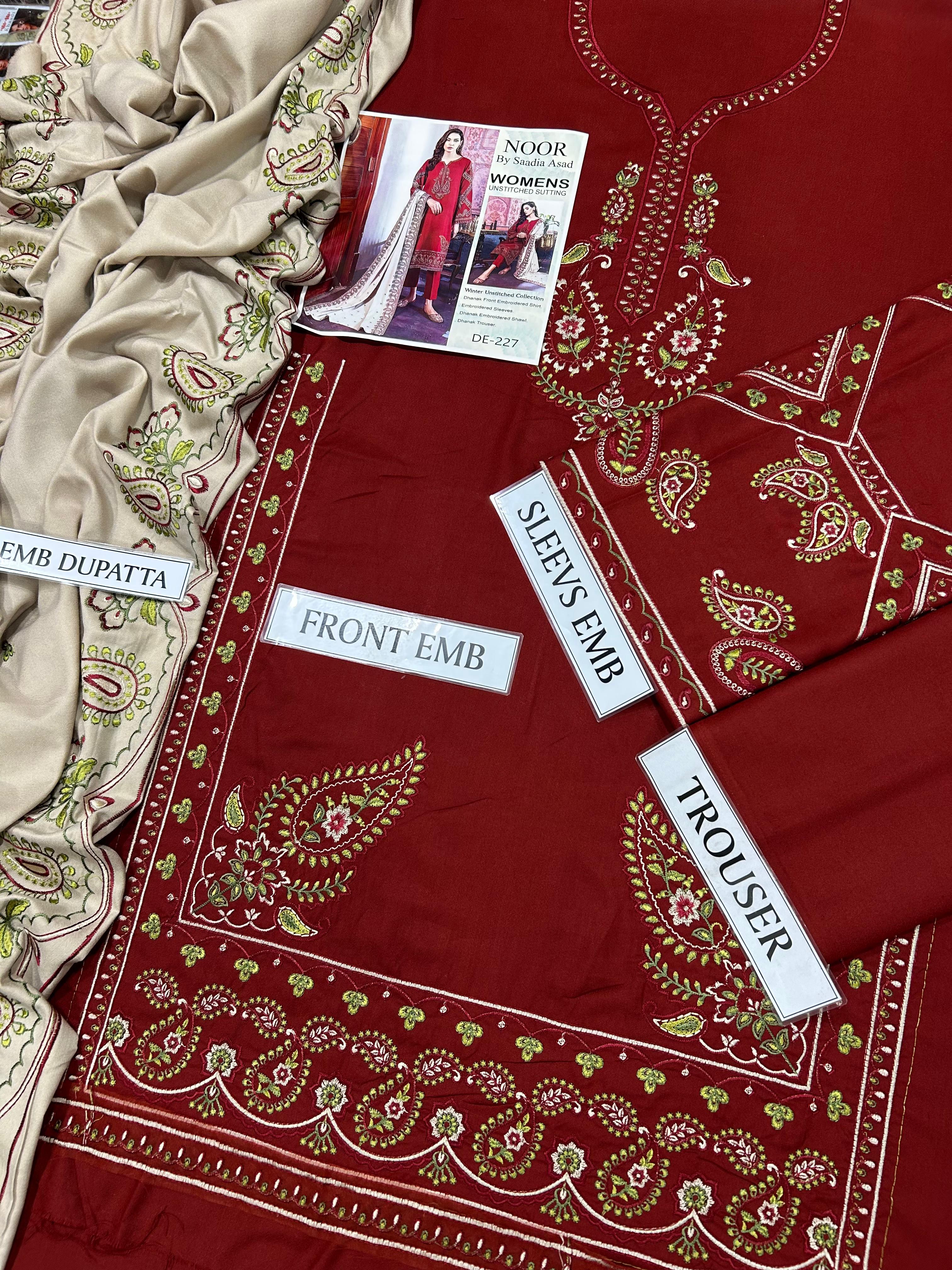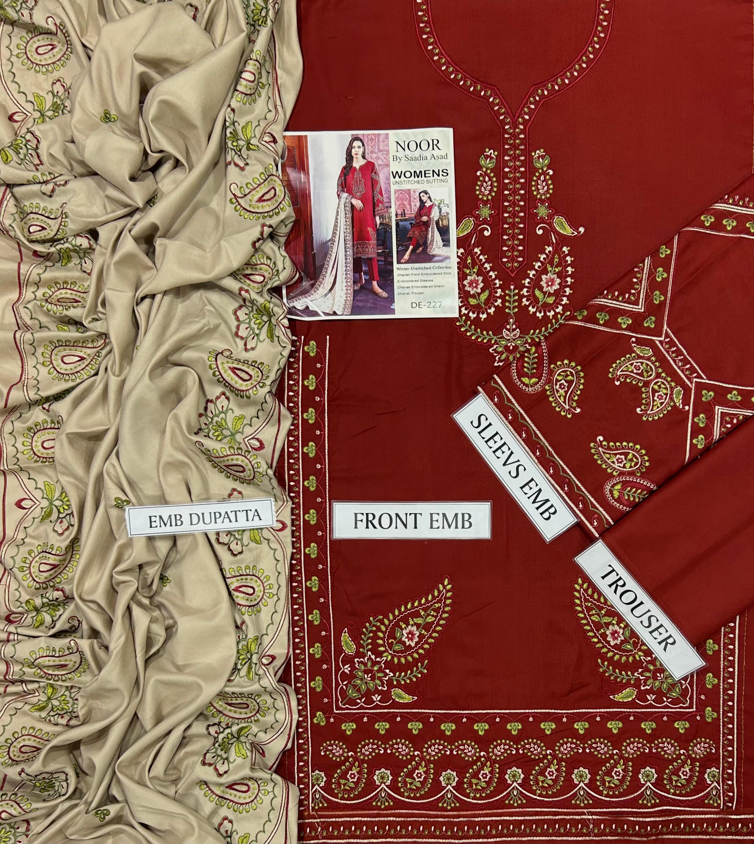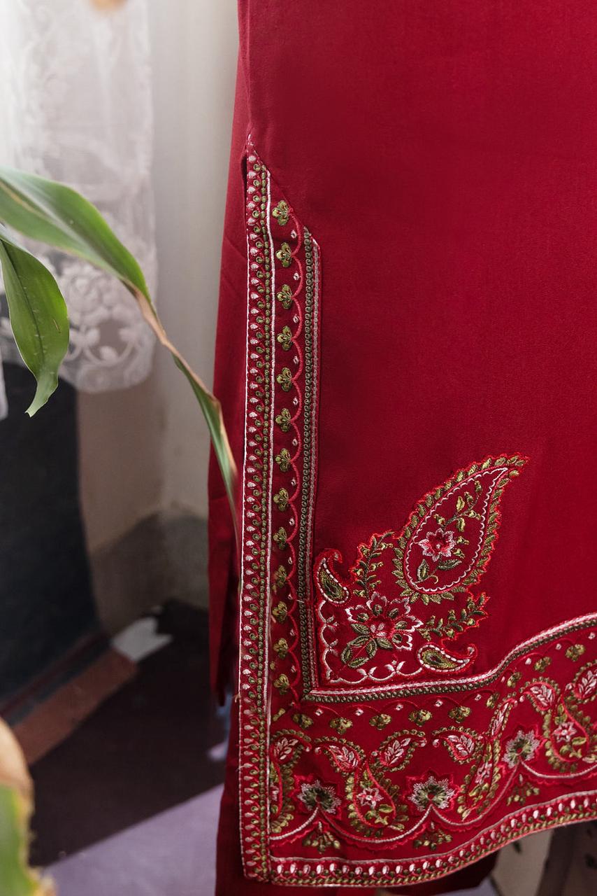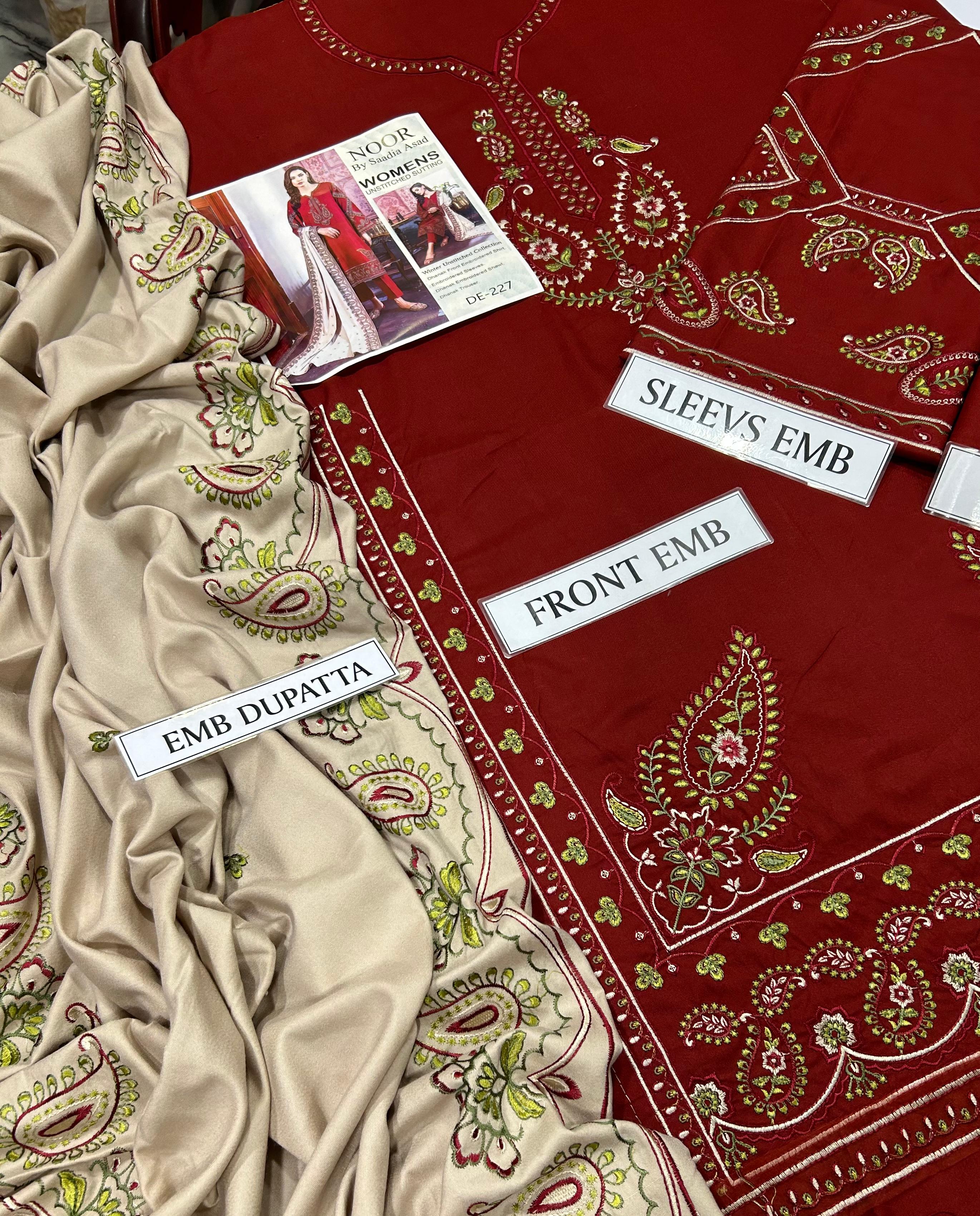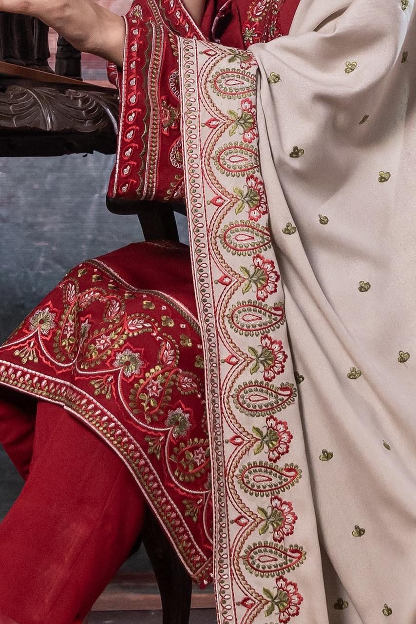 The design speaks in the language of luxury. The front and sleeves are a canvas of heavy, intricate embroidery, each thread laid with precision to create a rich, textured narrative. The embroidered neck and daman provide a beautifully framed elegance, while the heavy embroidered Dhanak shawl completes your look with undeniable grandeur.